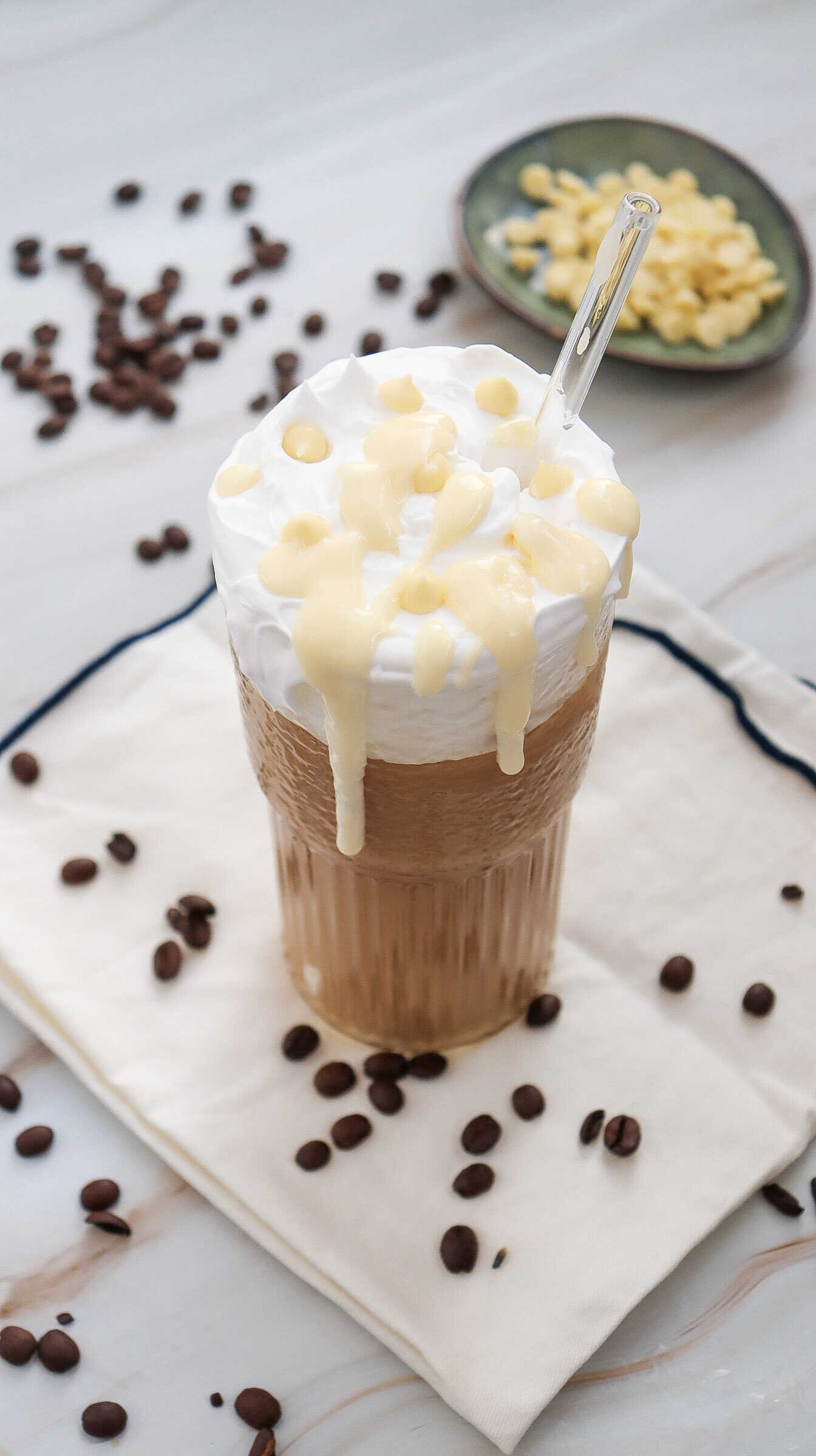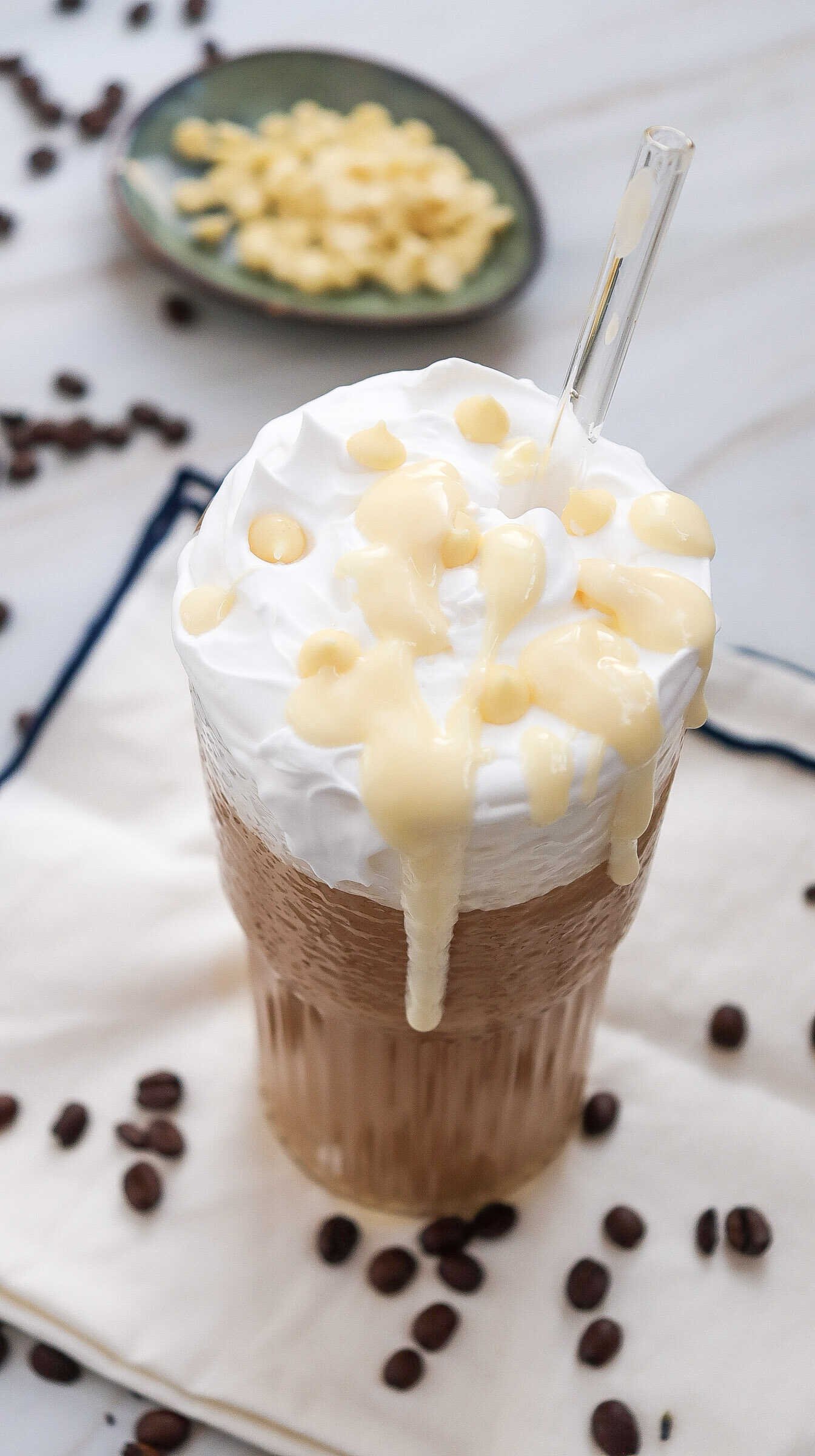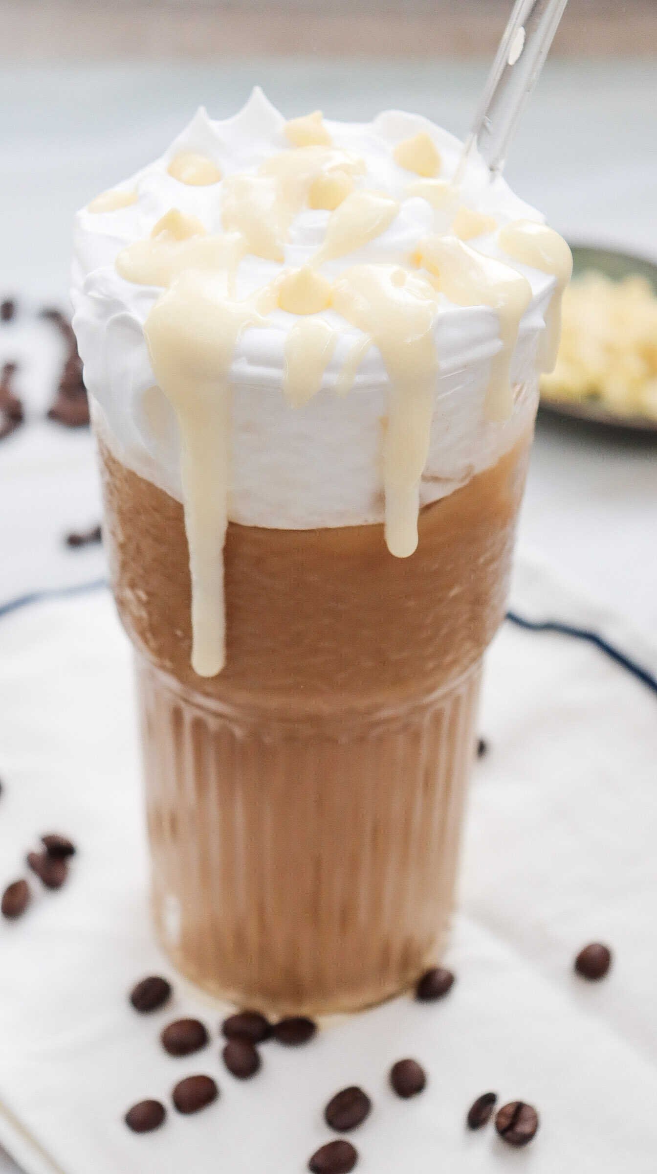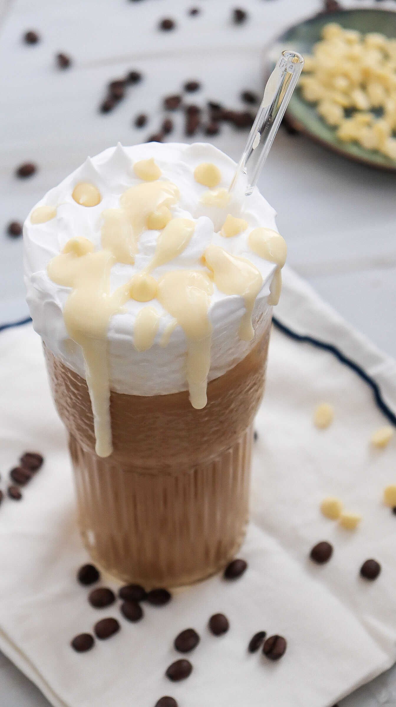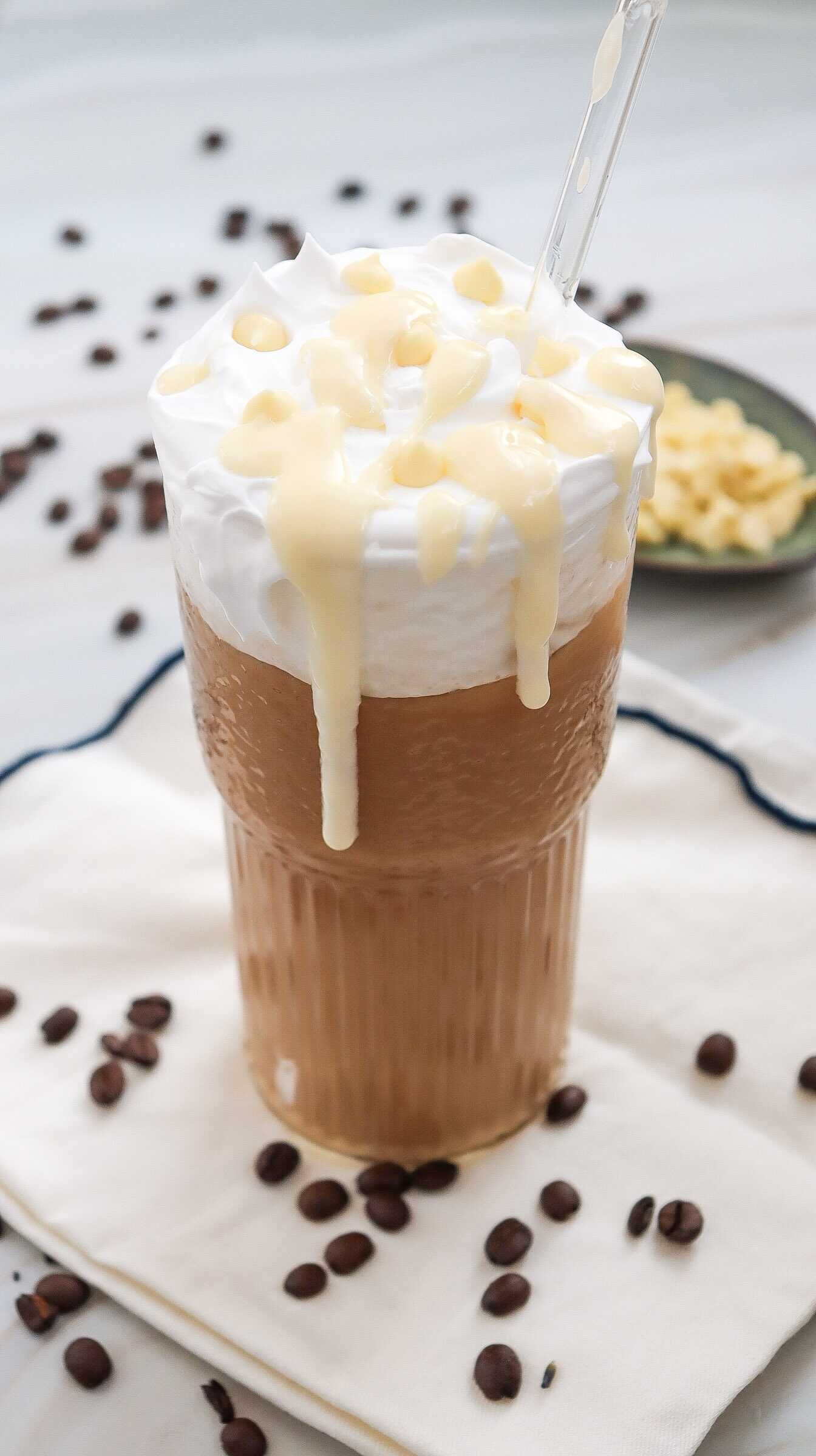 Smooth and creamy iced white chocolate mocha topped with whipped cream and rich white chocolate drizzle, styled with coffee beans for a cozy homemade drink