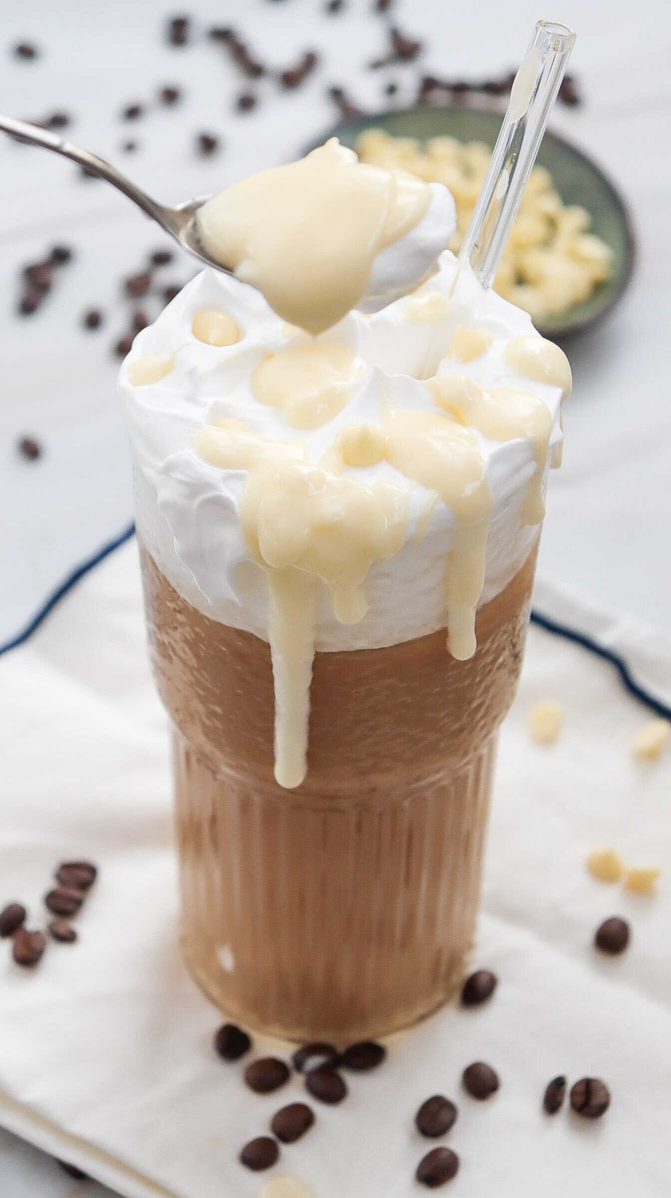 Unlike regular mocha drinks, which use dark chocolate, white chocolate offers a softer, more dessert-like flavor that pairs beautifully with iced coffee.