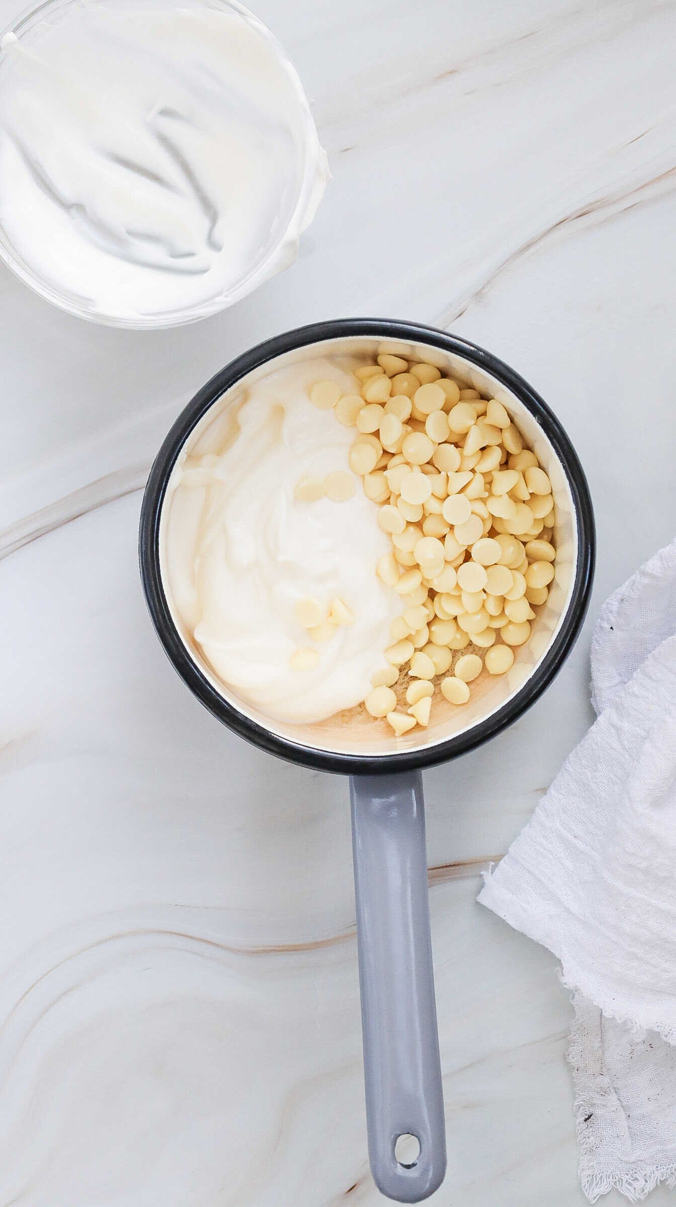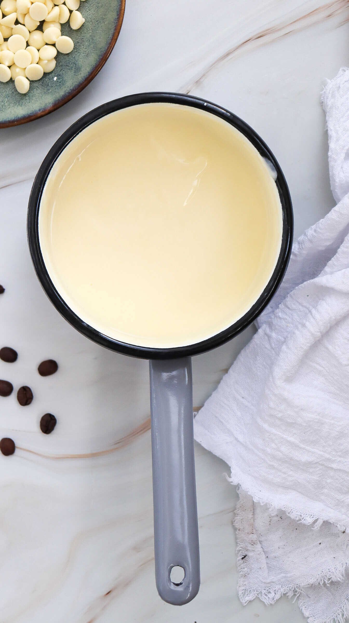 In a saucepan over low heat, combine the white chocolate chips and heavy cream (or milk). Stir continuously to prevent burning. The chocolate will slowly melt into a silky, smooth mixture. - Add Flavors