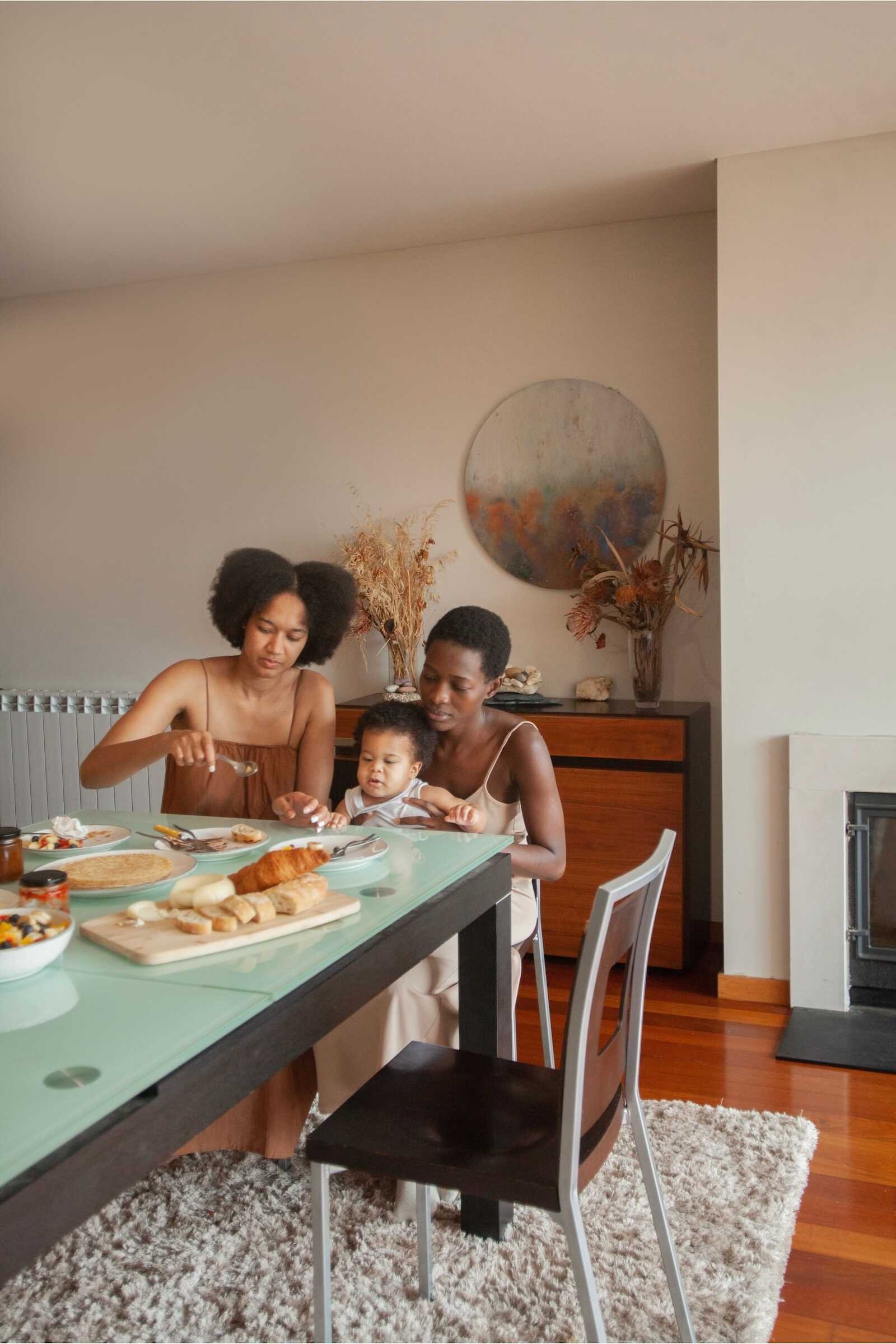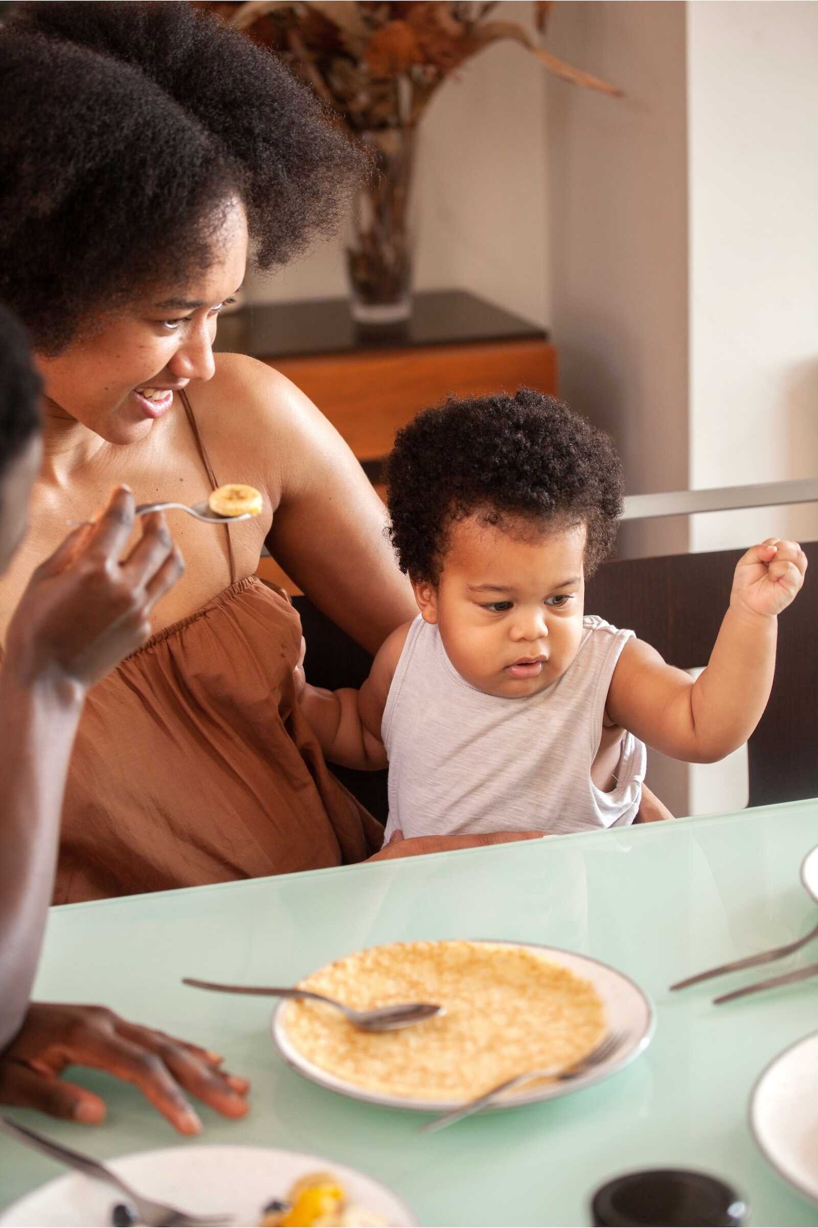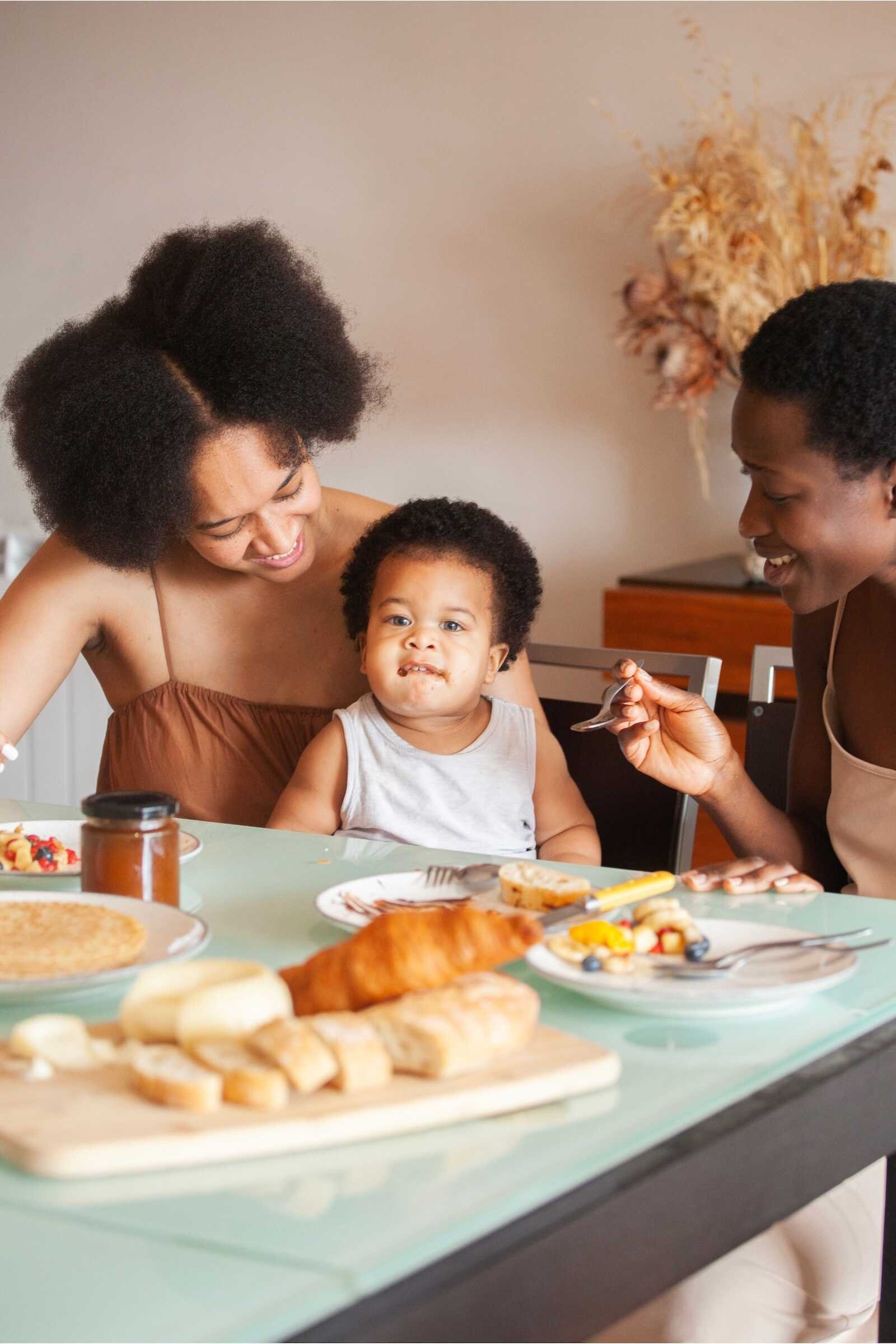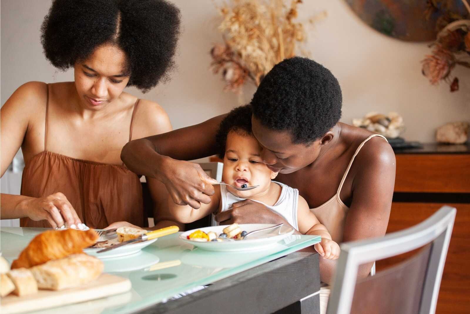 A natural parents and baby photoshoot capturing a loving moment as parents feed their baby during a relaxed family meal.
