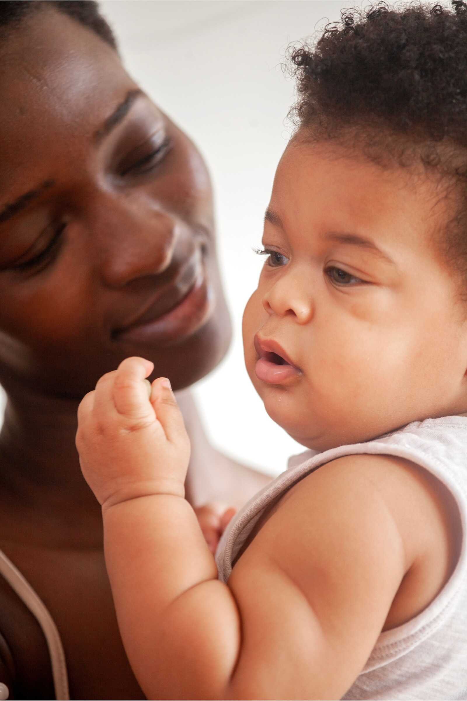 At this age, babies are more alert and starting to make eye contact.