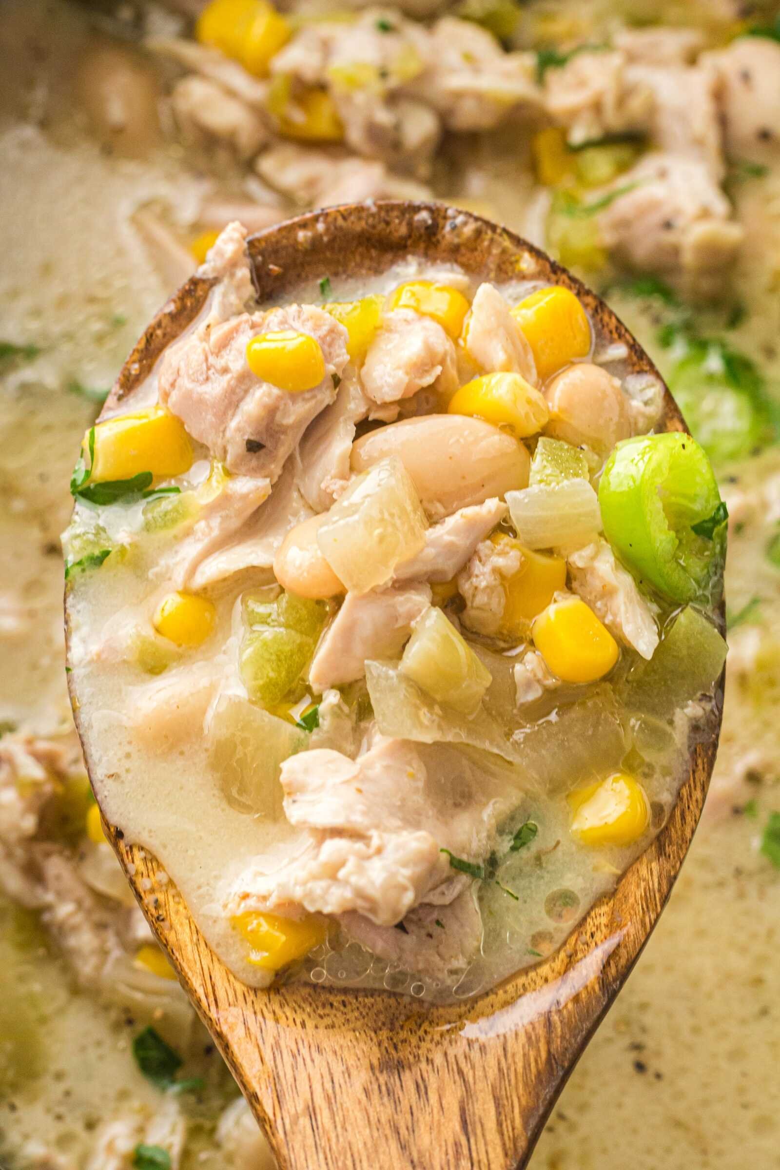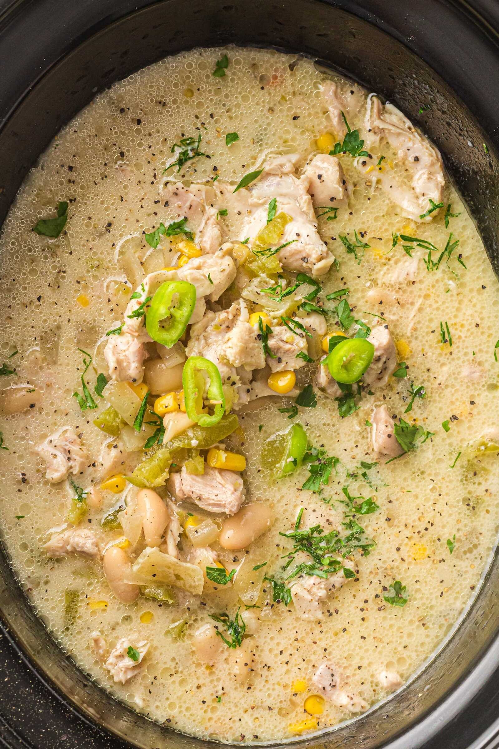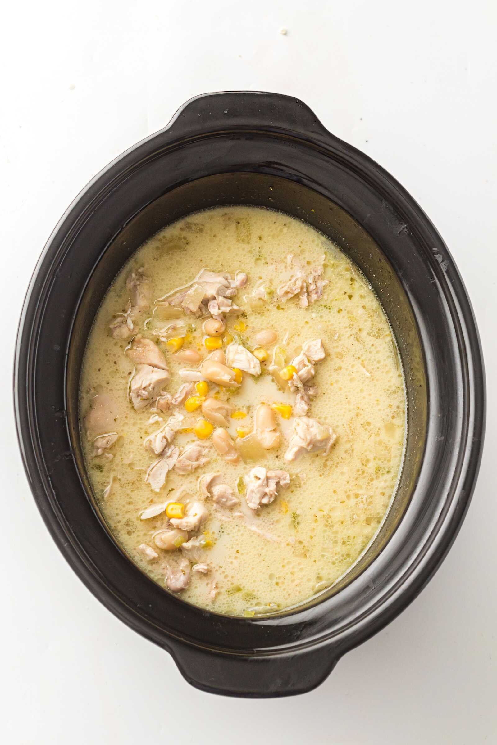 Second, the flavors are comforting yet balanced. The chicken becomes tender and juicy during the slow cooking process, while the beans and corn add texture and sweetness. The cream cheese and cream at the end transform the broth into a rich, creamy chili base.