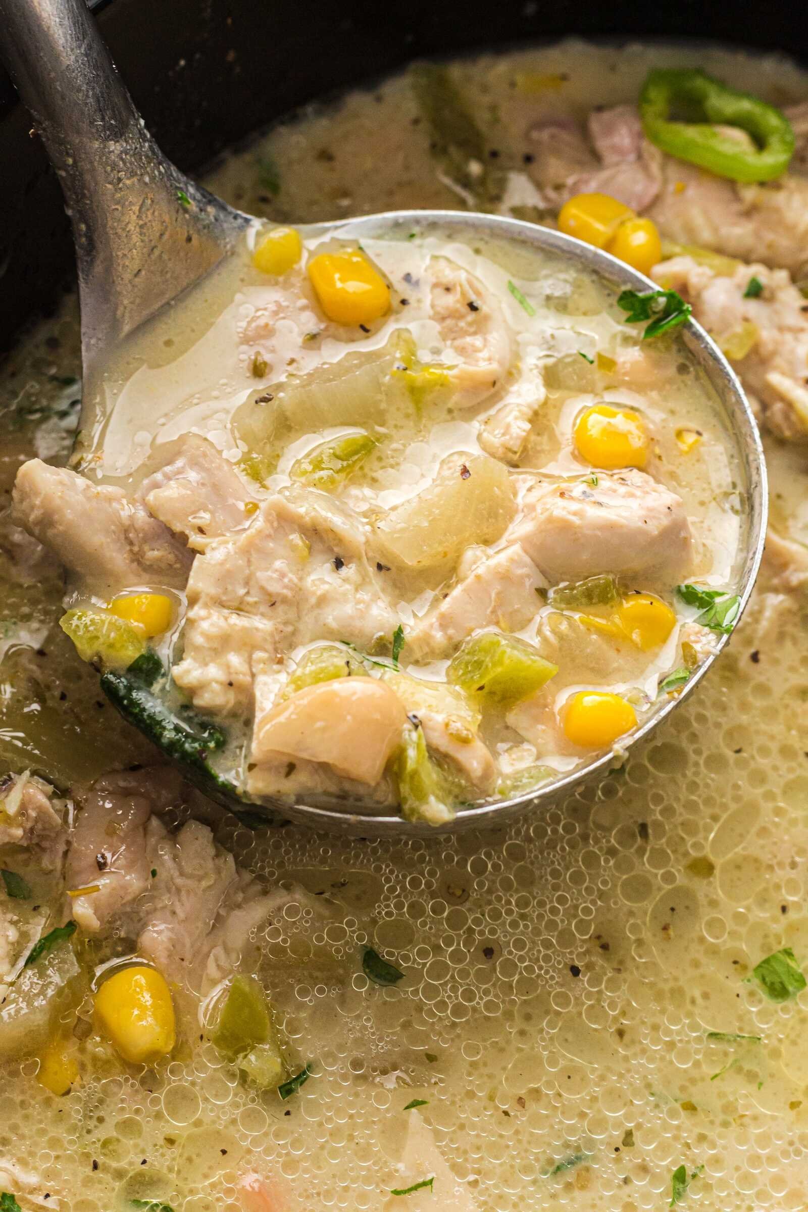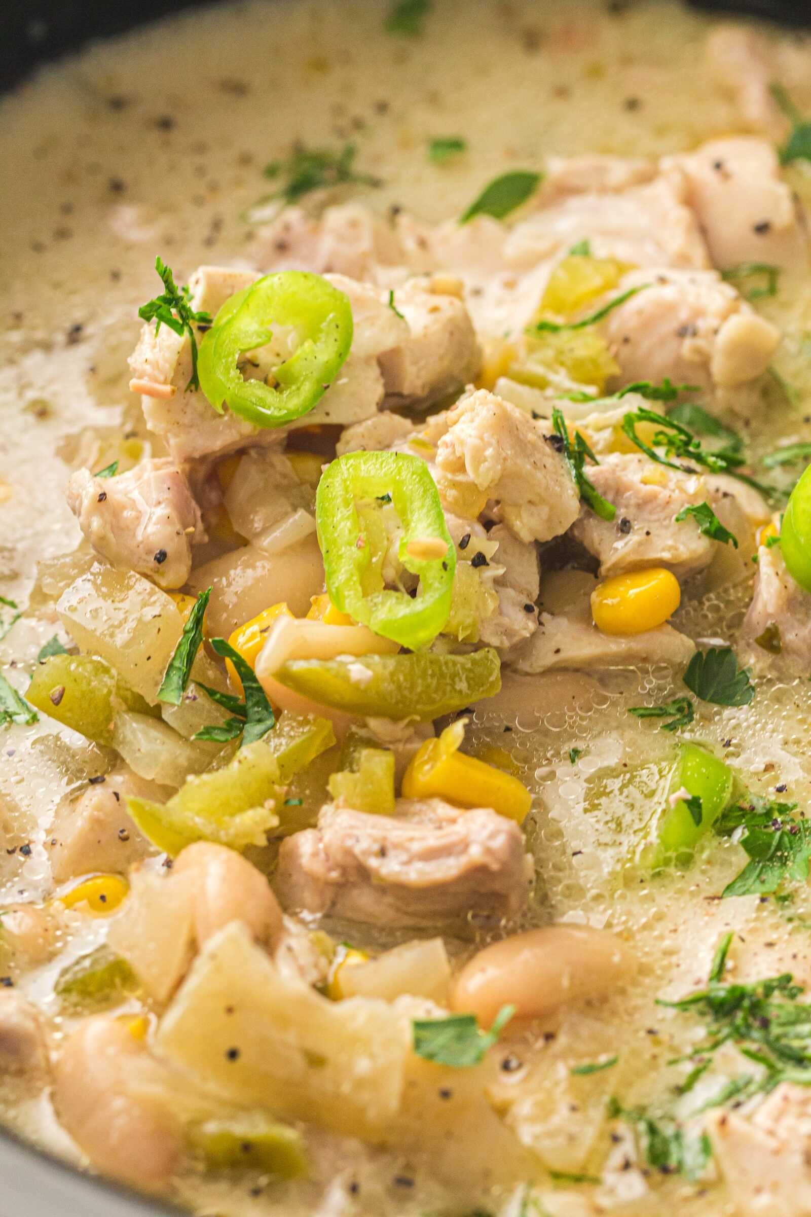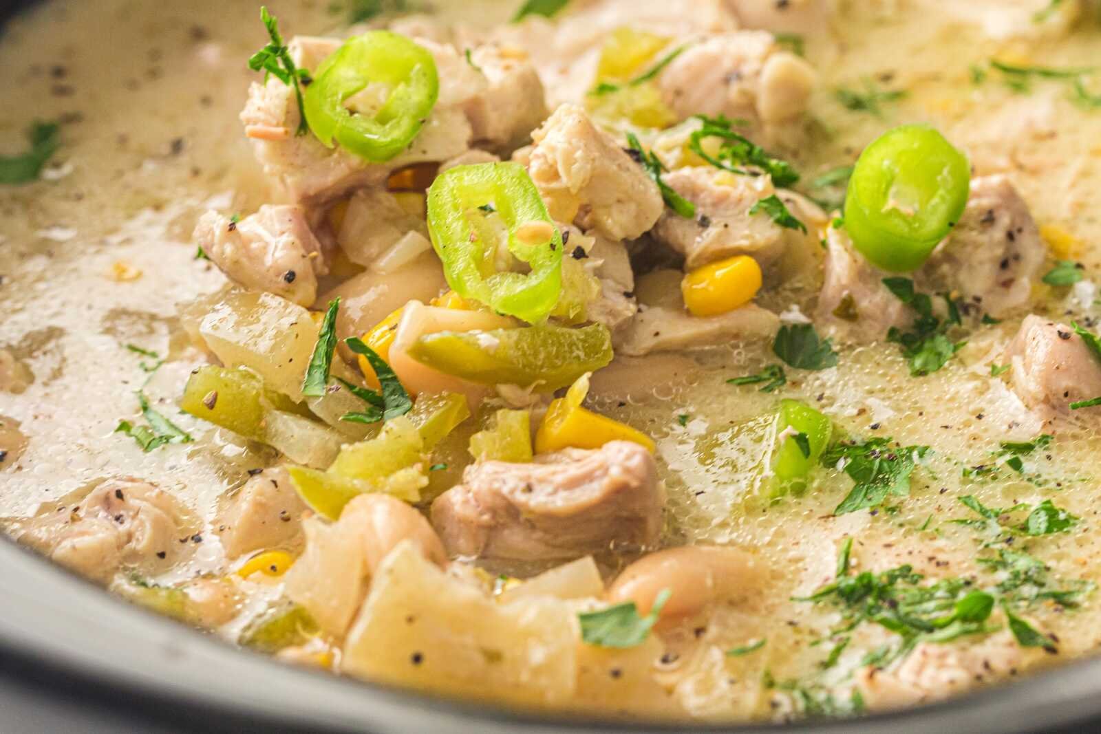 Instead of tomato-based broth, the base is made from chicken broth and cream cheese, which creates a creamy, velvety soup-like chili.