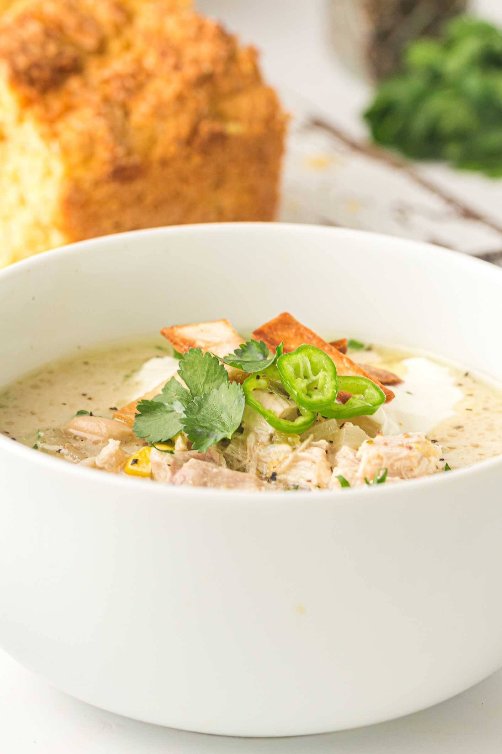 Creamy slow cooker white chicken chili garnished with sour cream, cilantro, jalapeño slices, and crispy tortilla strips served with a side of cornbread.
