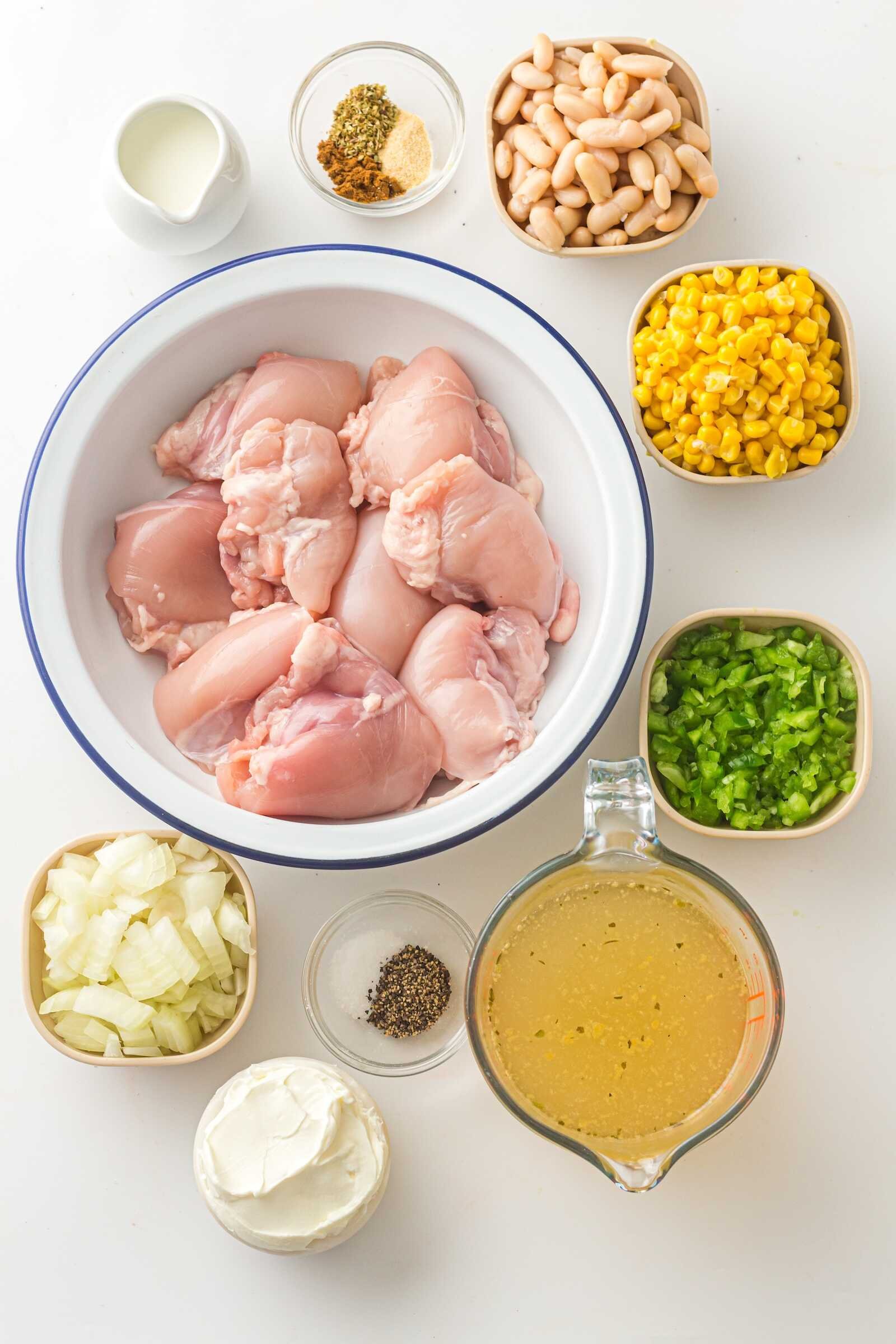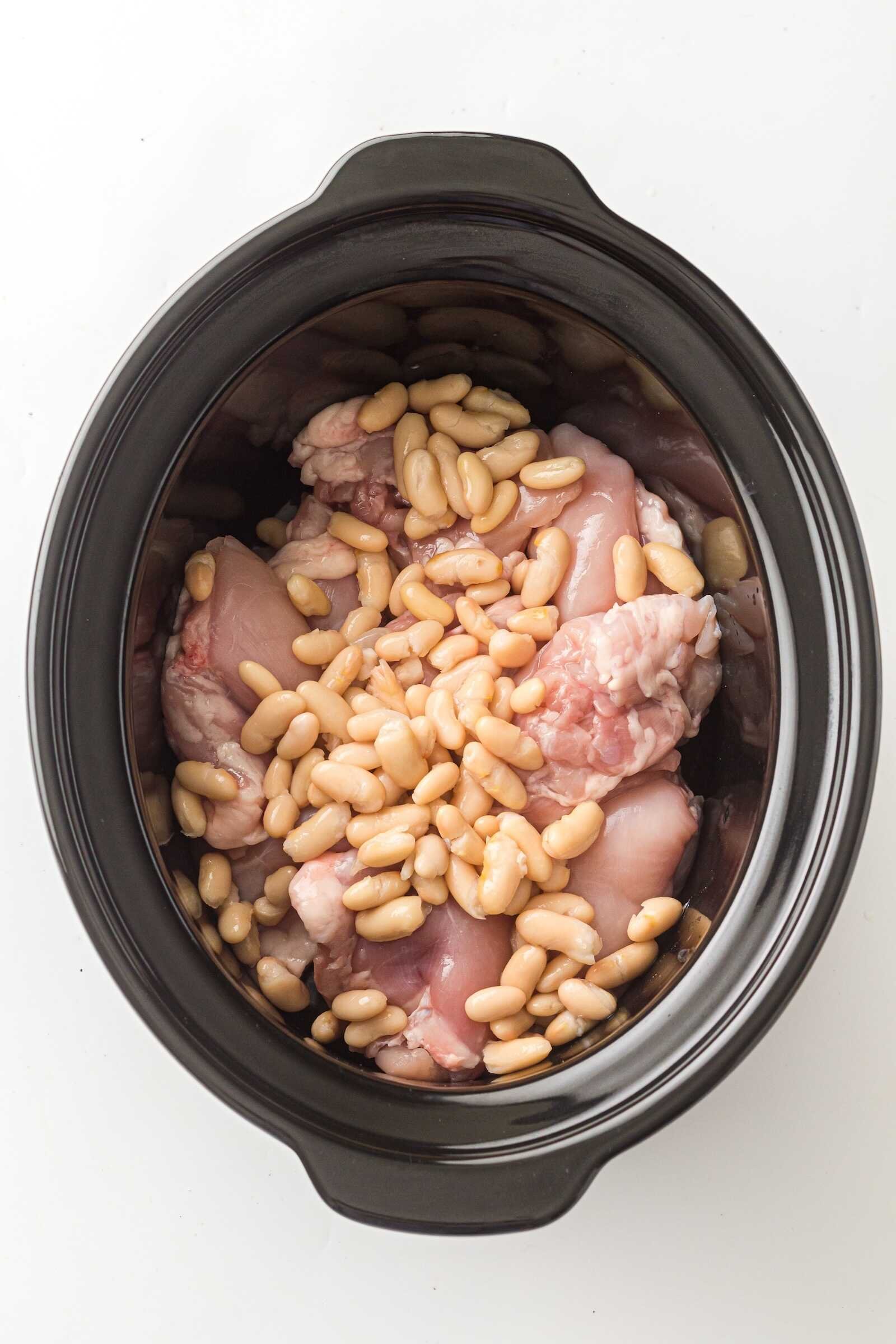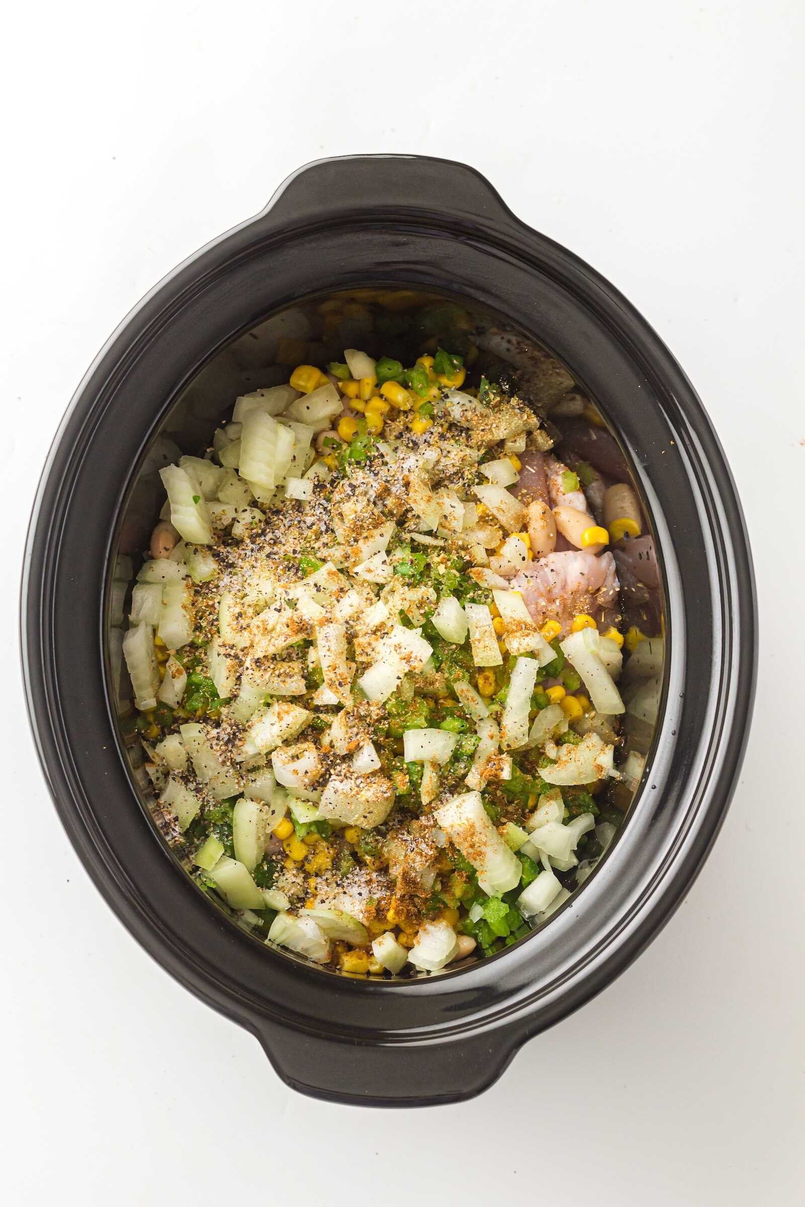 Place the chicken breasts (or thighs) in the bottom of the slow cooker. Add the white beans, corn, diced green chilies, chopped onion, and chicken broth.