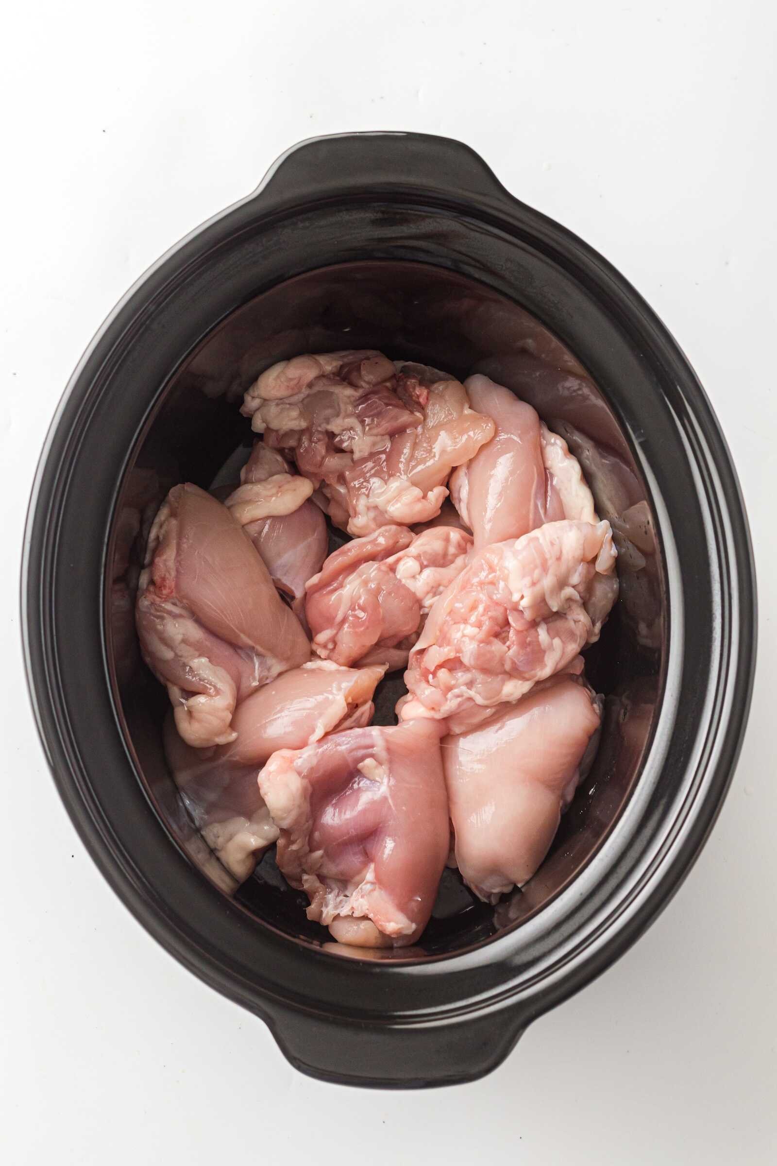 Chicken thighs stay slightly juicier than chicken breasts during long cooking times. Either option works great, but thighs will give a richer flavor.